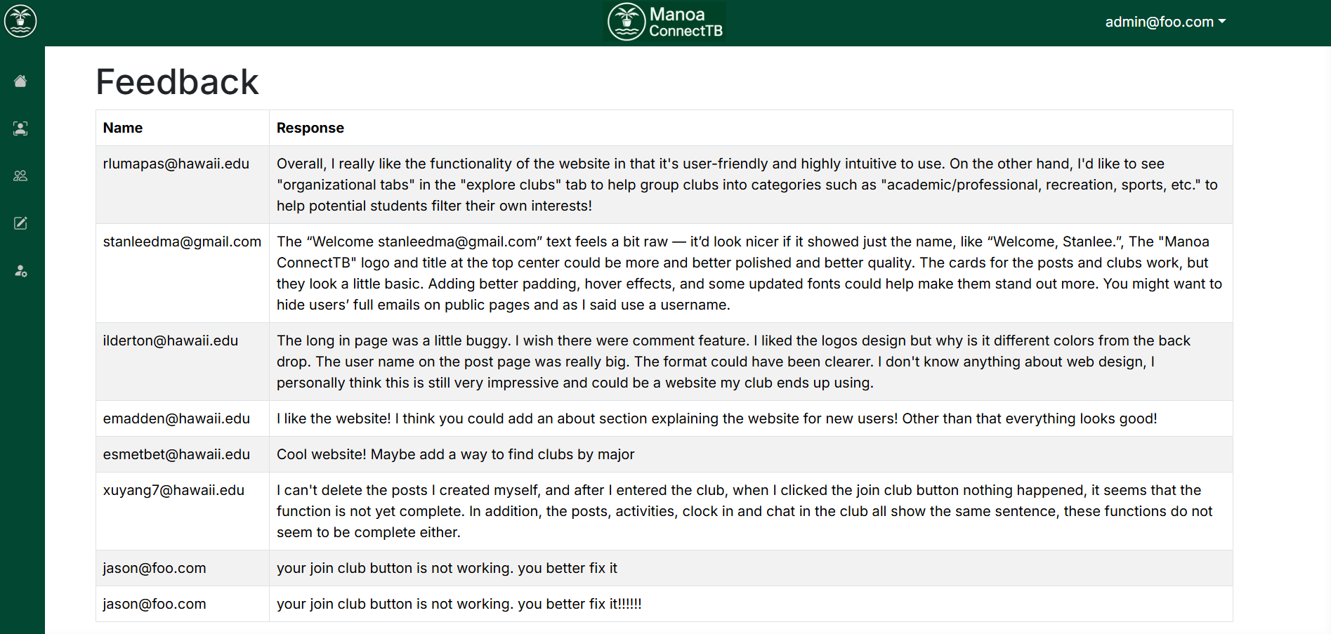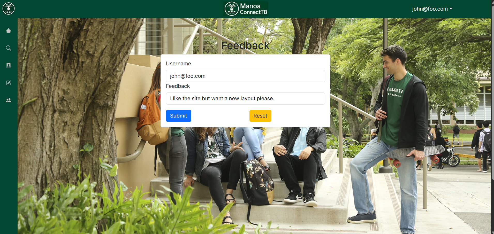 For the project, my main contributions dealt with the sidebar, the feedback page, and being the main updater of the project’s home page. The sidebar was our main navigation tool for going between the pages of our website. The feedback page was designed to collect user feedback and store it in the database in order to be seen by the site admins, AKA our group of developers. The project home page is a collection of the progress we have made throughout the entire process and gives an overview of why we created ManoaConnect and what it does.